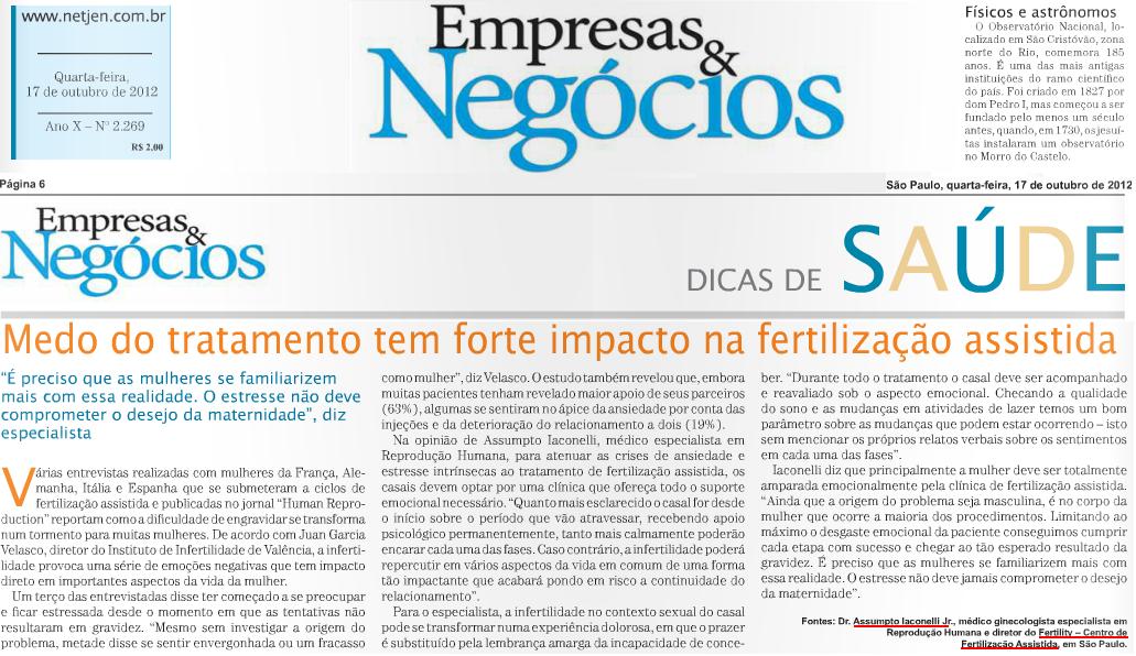 Clipping JORNAL EMPRESAS & NEGÓCIOS - Medo do tratamento tem forte impacto na fertilização assistida 17/10/2012