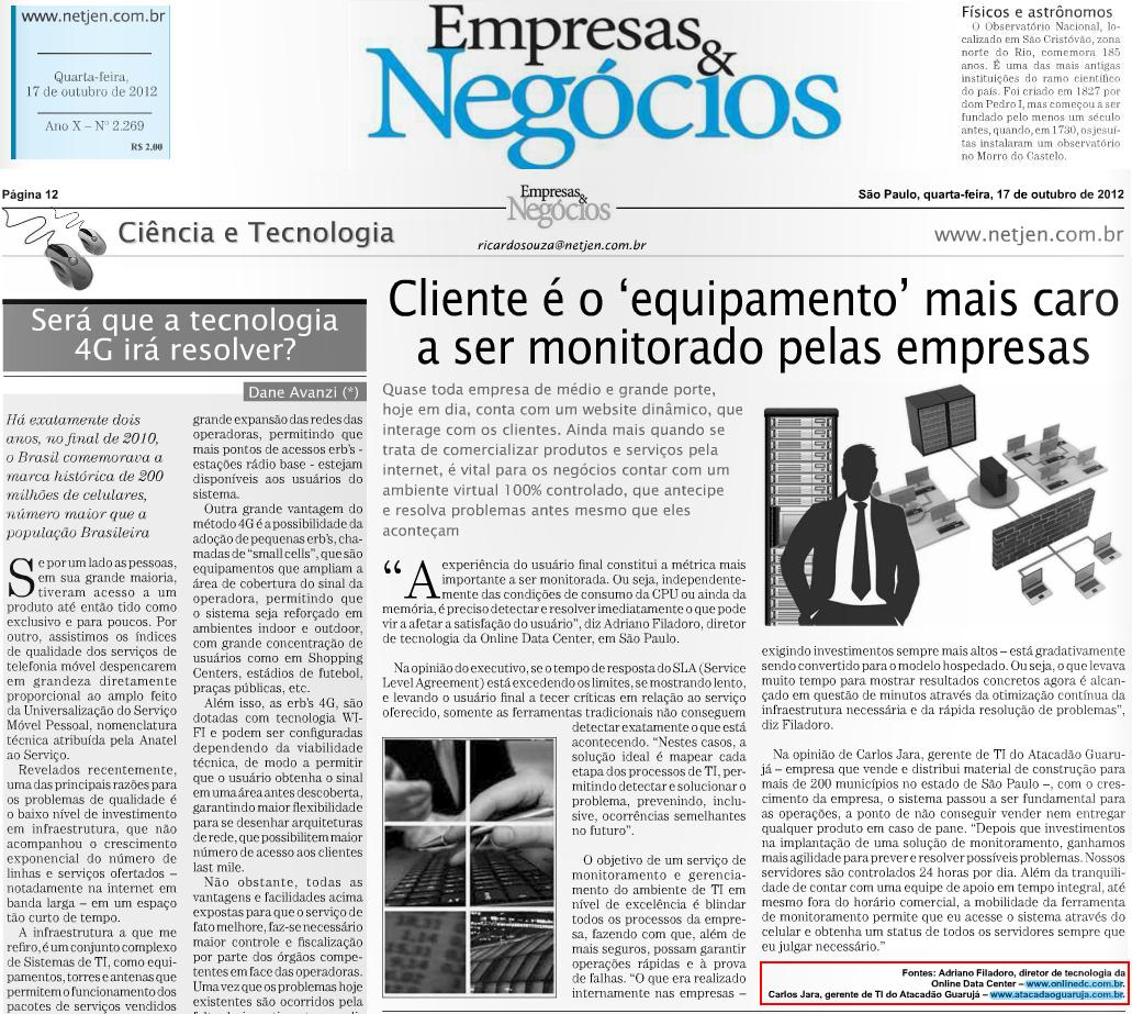 Clipping JORNAL EMPRESAS & NEGÓCIOS - Cliente é o ‘equipamento’ mais caro a ser monitorado pelas empresas 17/10/2012
