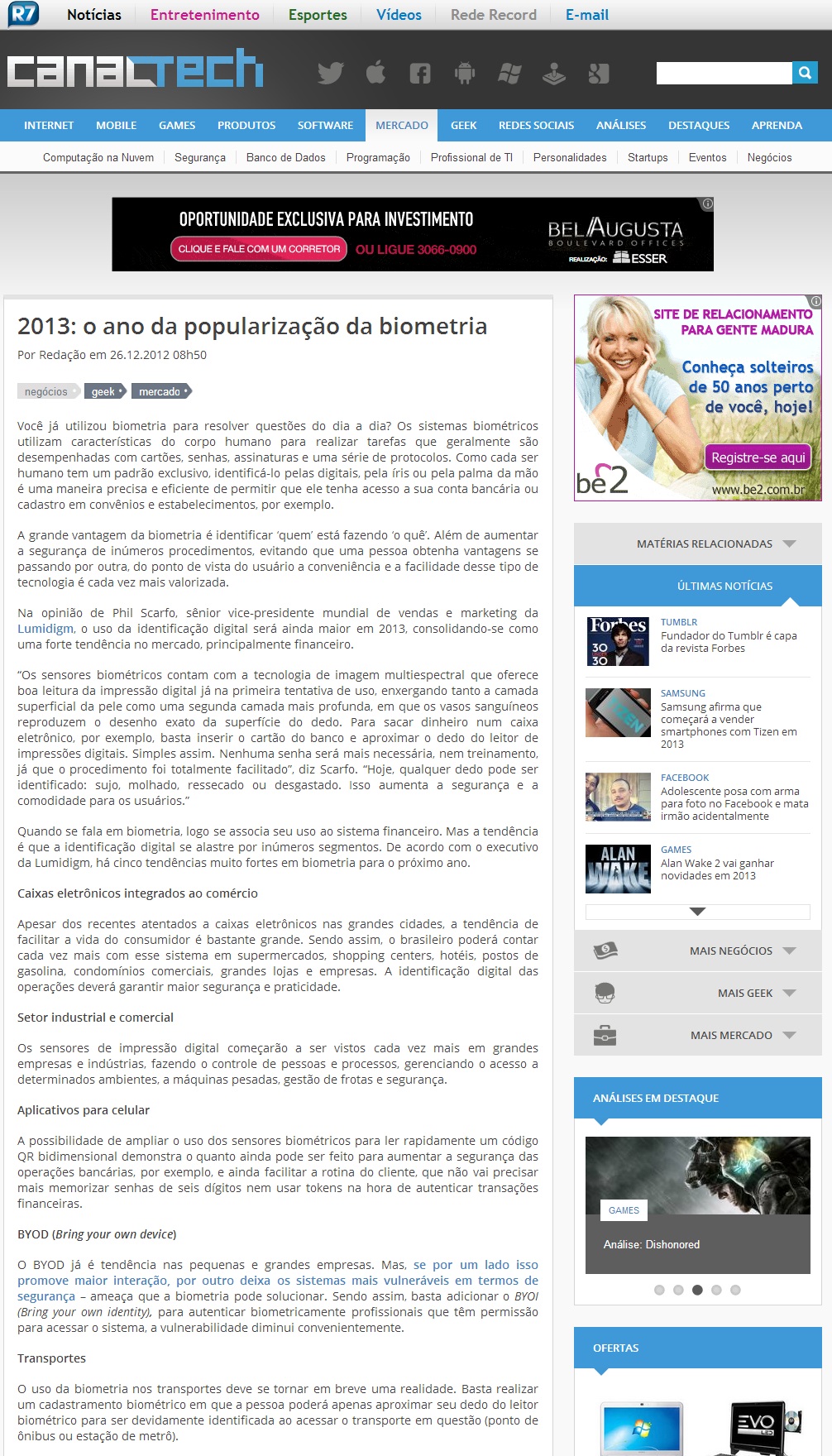 CANALTECH (PORTAL R7) - 2013: ano da popularização da biometria