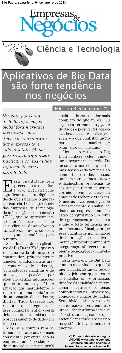 Clipping JORNAL EMPRESAS & NEGÓCIOS (IMPRESSO) - Aplicativos de Big Data são forte tendência nos negócios 04/01/2013