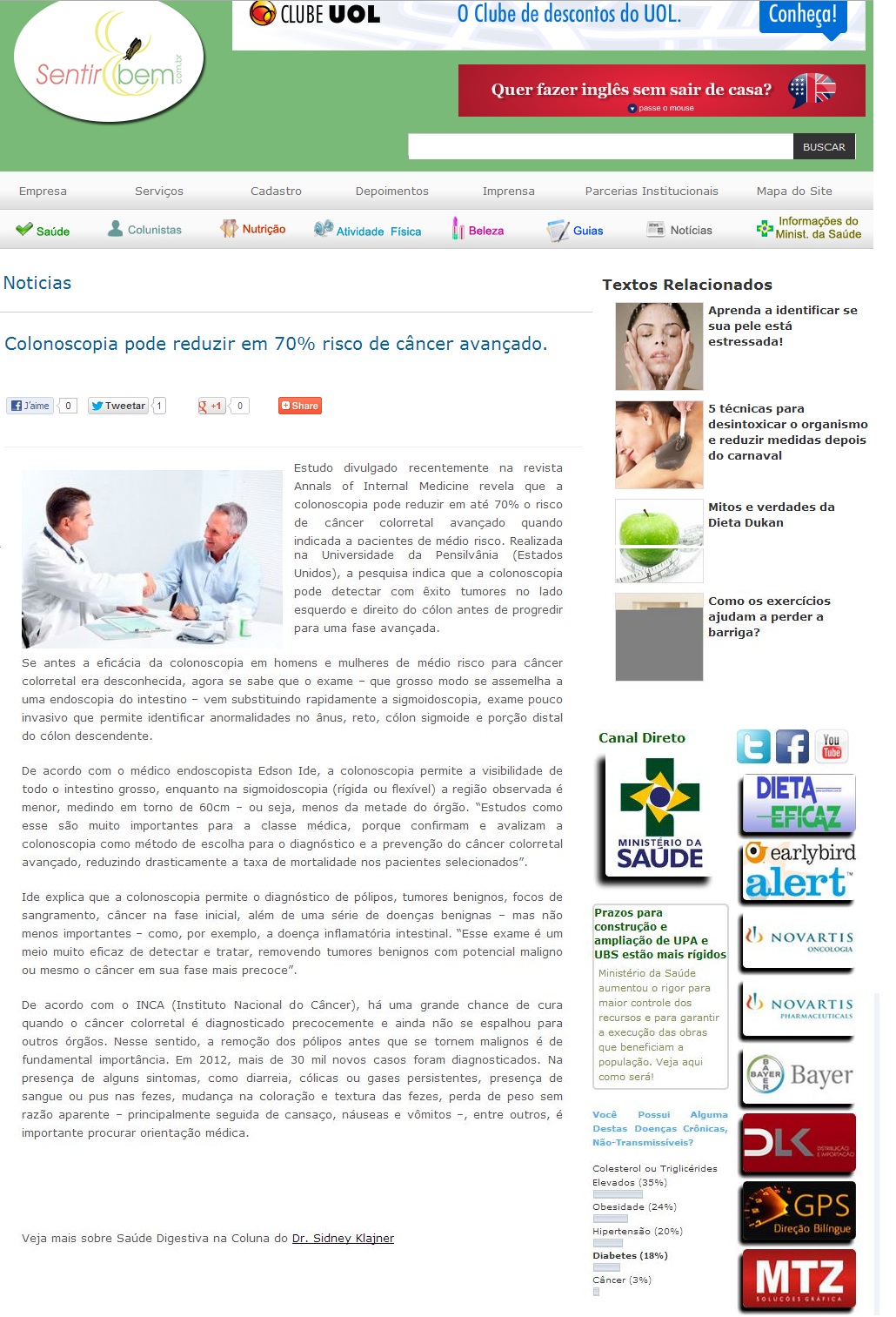 Clipping PORTAL UOL (SENTIR BEM) - Colonoscopia pode reduzir em 70% risco de câncer avançado 13/03/2013