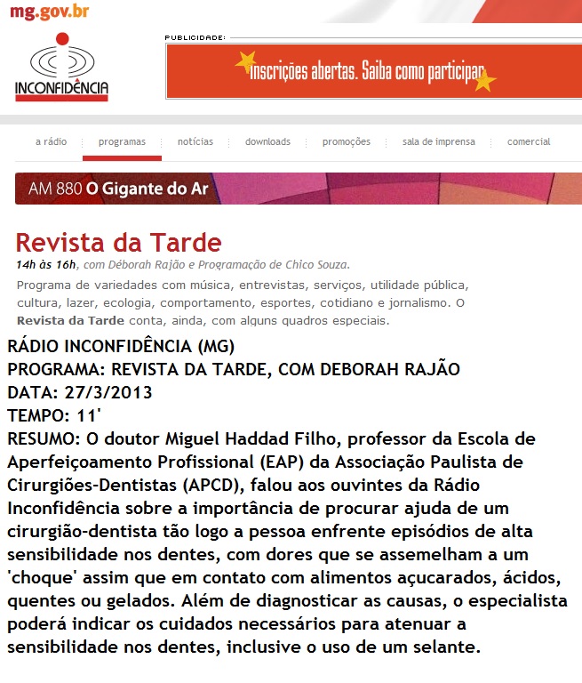 Clipping RÁDIO INCONFIDÊNCIA (GOVERNO MG) - Entrevista com Dr. Miguel Haddad Filho sobre sensibilidade nos dentes 27/03/2013