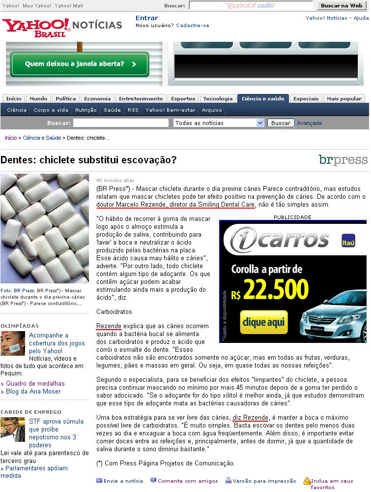Portal Yahoo (Chamada de capa + matéria) - Chiclete ajuda a prevenir cárie