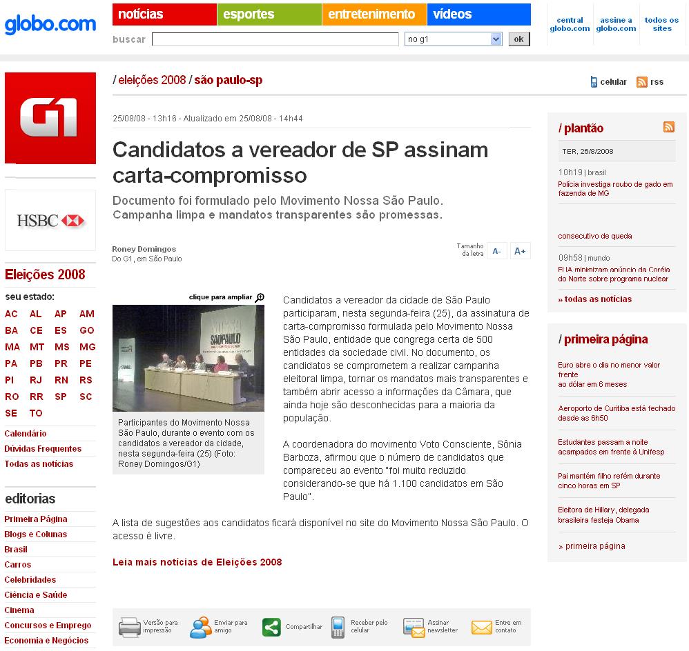 Portal G1 (Globo) - Candidatos a vereador de SP assinam carta-compromisso
