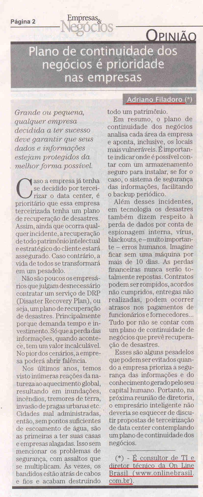 Clipping Jornal Empresas & Negócios (29 Ago) - Plano de continuidade dos negócios é prioridade 29/08/2008