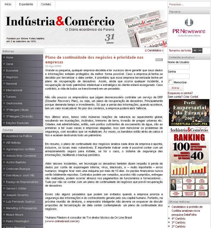 Clipping Jornal Indústria & Comércio - Plano de continuidade dos negócios é prioridade nas empresas 01/09/2008