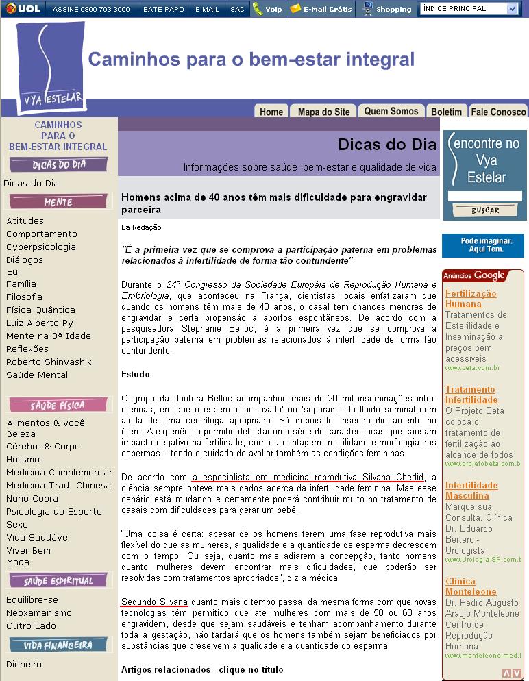 Clipping Portal UOL - Homens acima de 40 anos têm mais dificuldade para engravidar parceira 01/09/2008