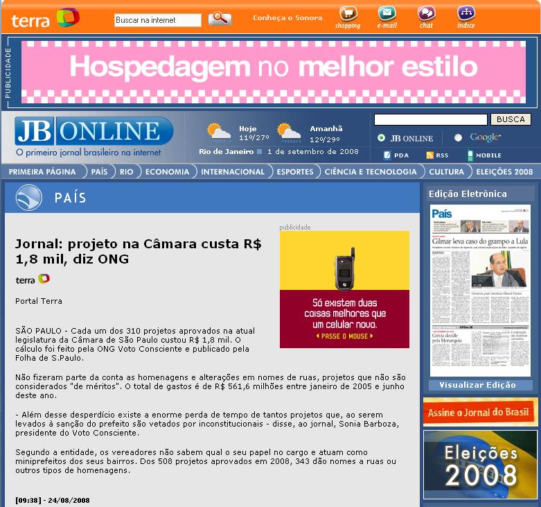 Clipping Jornal do Brasil on line (RJ) - Jornal: projeto na Câmara custa R$ 1,8 mil, diz ONG 02/09/2008