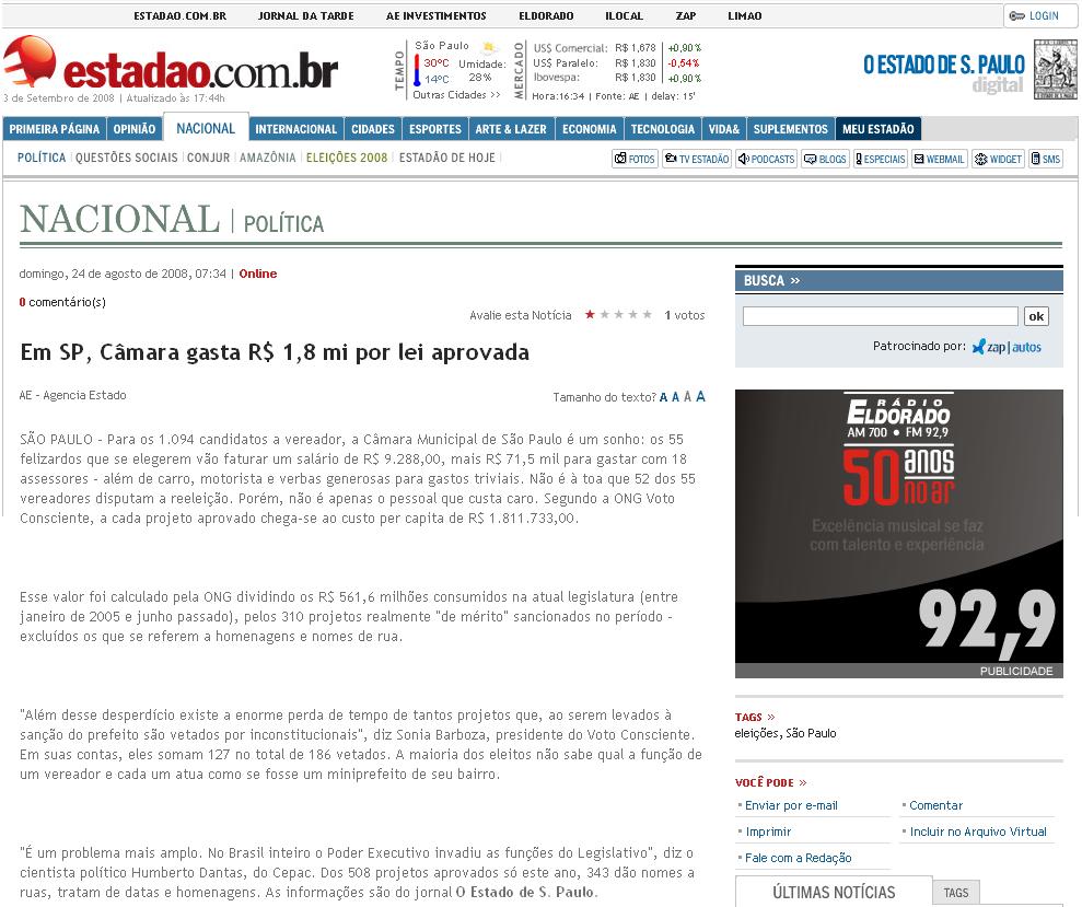Portal Estadão - Em SP, Câmara gasta R$ 1,8 mi por lei aprovada