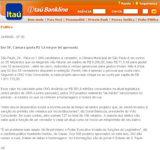Portal Itaú Bankline - Em SP, Câmara gasta R$ 1,8 mi por lei aprovada