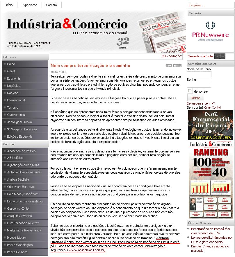 Jornal Indústria & Comércio (11 Set) - Nem sempre terceirização é o caminho