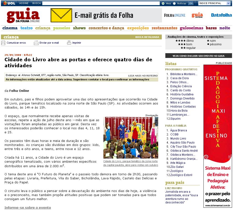 Clipping Guia da Folha on line - Cidade do Livro abre as portas e oferece quatro dias de atividades 30/09/2008