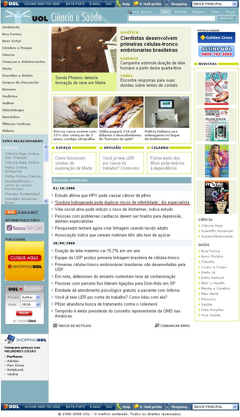 Clipping Portal UOL (Ciência & Saúde) - Gordura hidrogenada pode duplicar riscos de infertilidade 01/10/2008