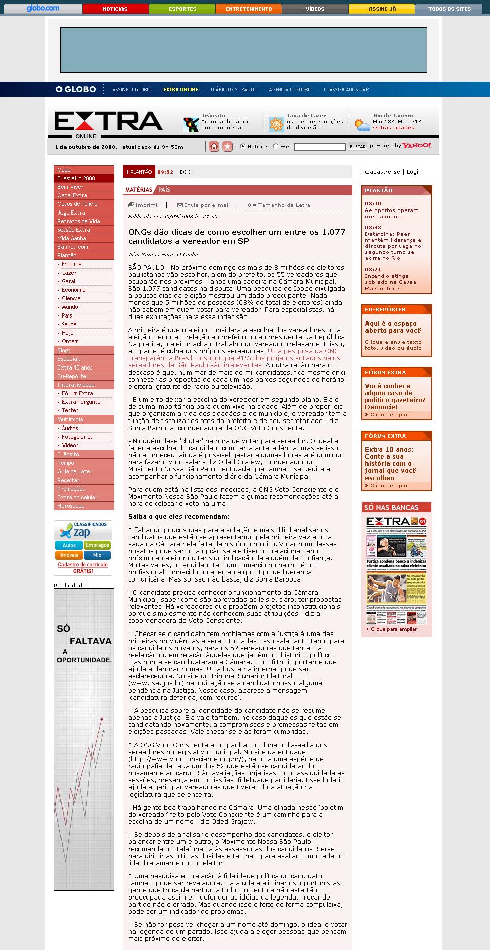 Clipping Jornal Extra on line (RJ) - ONGs dão dicas de como escolher um entre os 1077 candidatos a vereador em SP 01/10/2008