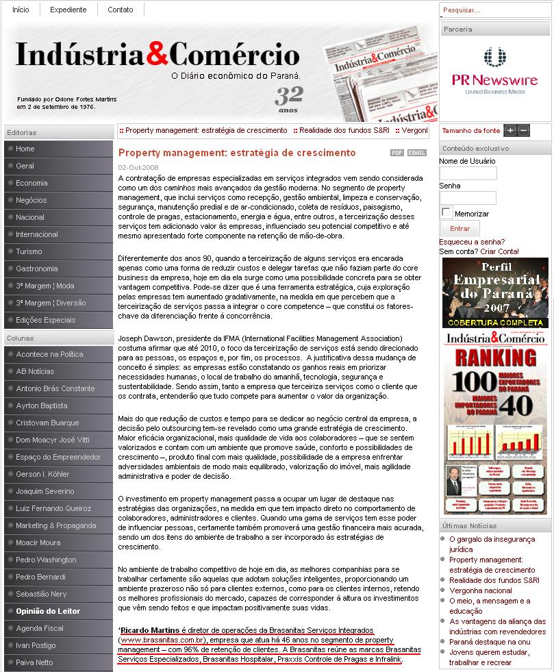 Clipping Jornal Indústria & Comércio (PR) - (2 Out) - Property management: estratégia de crescimento 02/10/2008