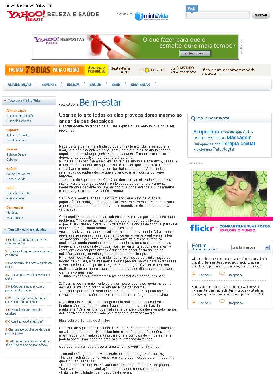 Clipping Portal Yahoo (Beleza & Saúde) - Usar salto alto todos os dias provoca dores mesmo ao andar de pés descalços 03/10/2008