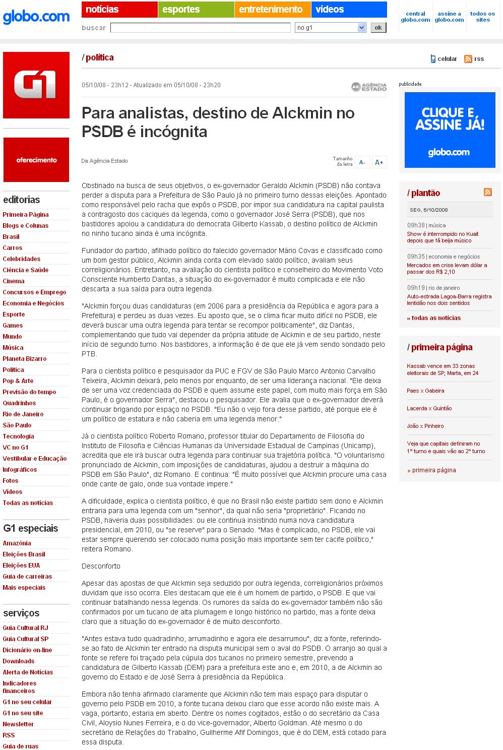 Portal G1 (Globo) - Para analistas, destino de Alckmin no PSDB é incógnita
