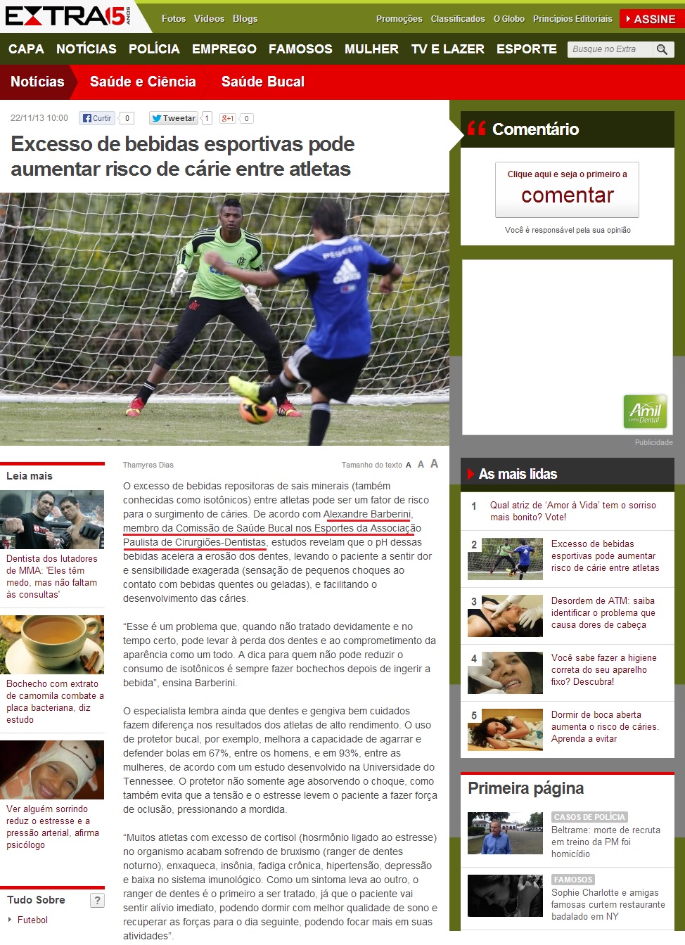 Clipping JORNAL EXTRA (ONLINE) - Excesso de bebidas esportivas pode aumentar risco de cáries entre atletas 22/11/2013