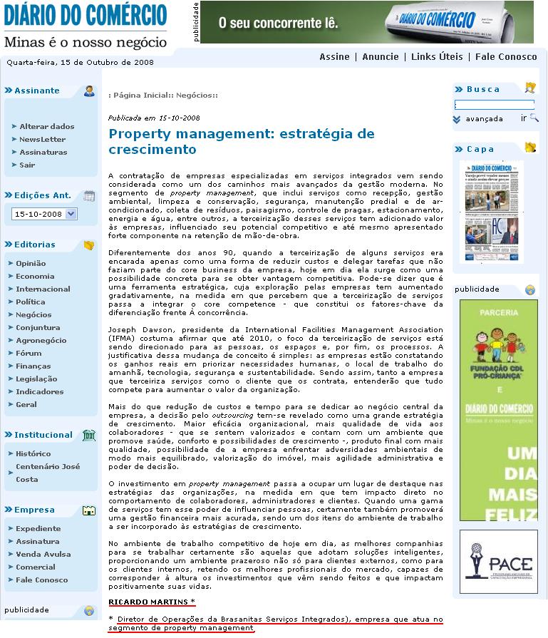Clipping Diário do Comércio - MG (15 Out) - Property management: estratégia de crescimento 15/10/2008