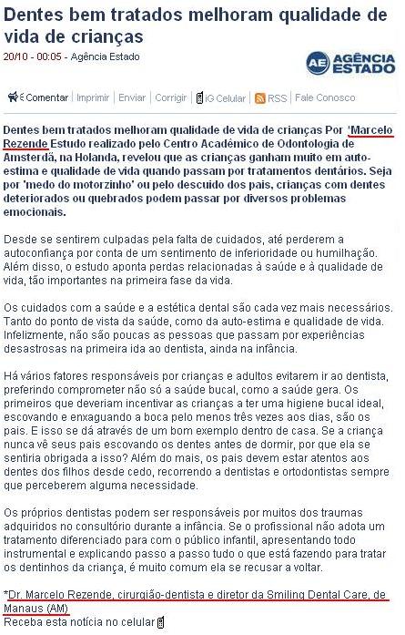 Clipping Agência Estado (AE) - Dentes bem tratados melhoram qualidade de vida das crianças 20/10/2008