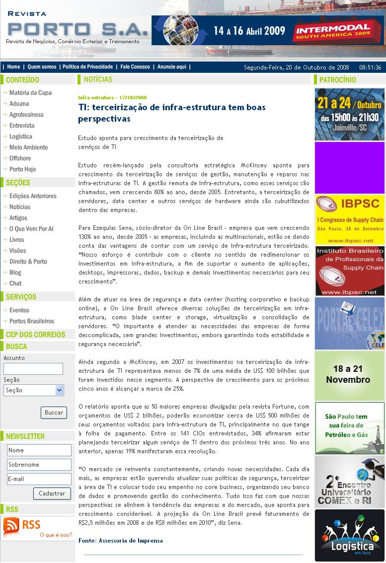 Clipping Revista Porto S.A. on line - TI: terceirização de infra-estrutura tem boas perspectivas 20/10/2008