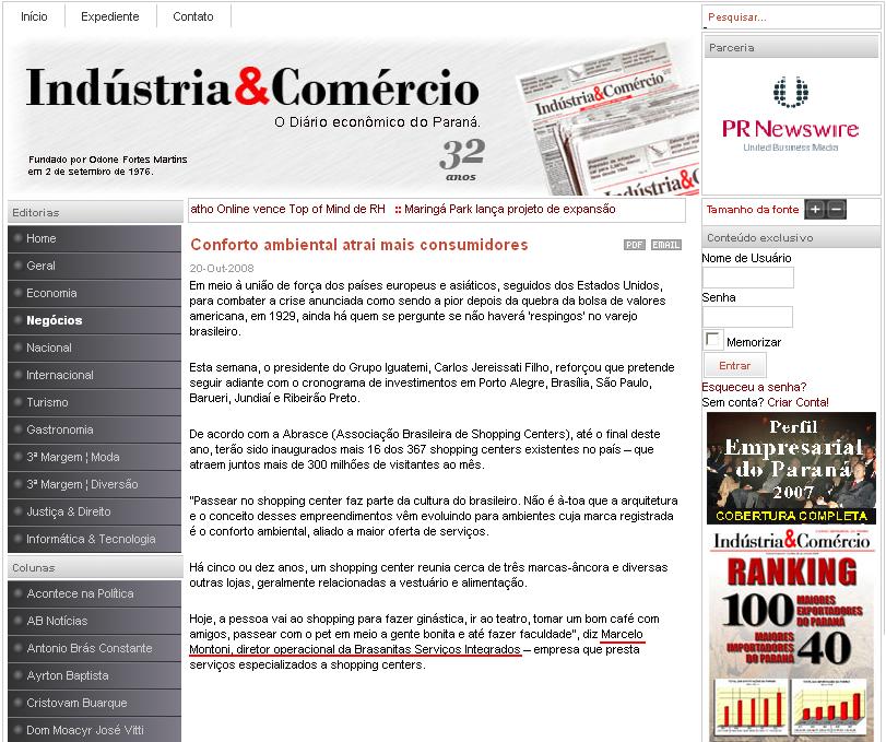 Clipping Jornal Indústria & Comércio (20 Out) - Conforto ambiental atrai mais consumidores 22/10/2008