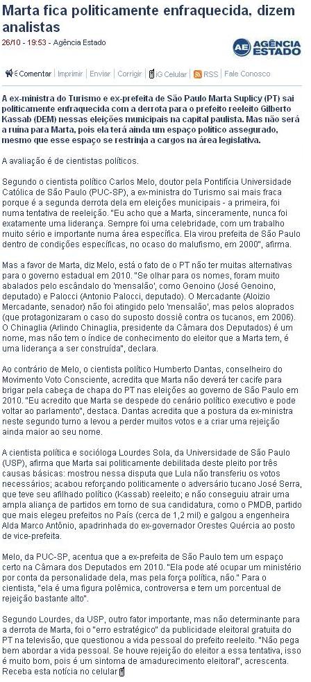 Agência Estado (AE) - Marta fica politicamente enfraquecida, dizem analistas
