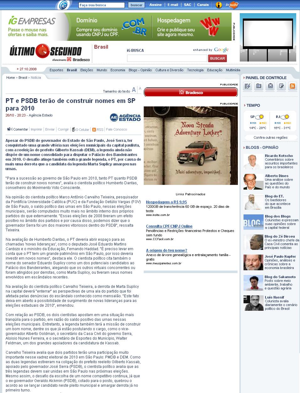 Portal IG (Último Segundo) - PT e PSDB terão de construir nomes em SP para 2010