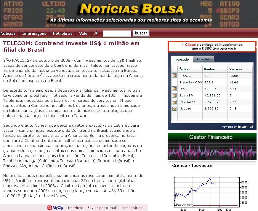 Notícias Bolsa (Bovespa) - Comtrend investe US$ 1 milhão em filial do Brasil