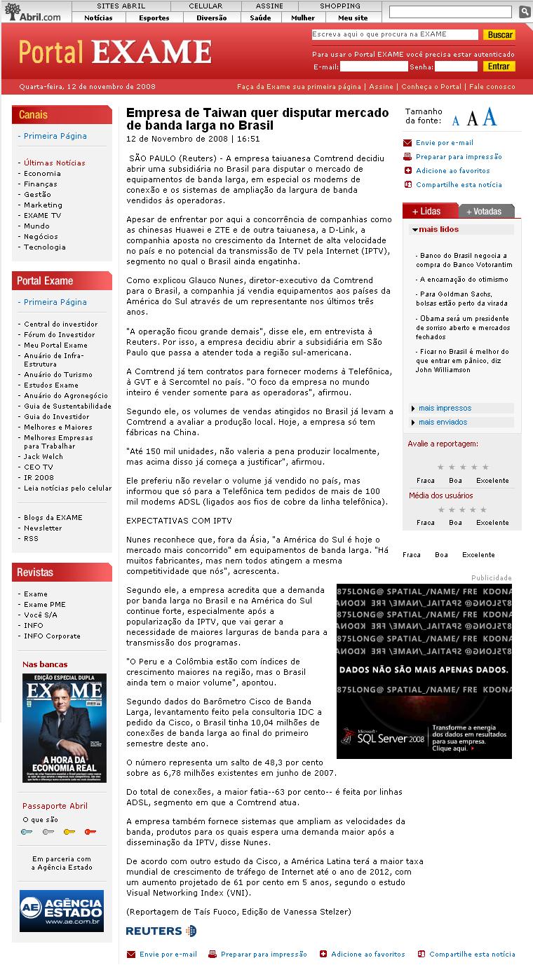 Portal Exame - Empresa de Taiwan quer disputar mercado de banda larga no Brasil