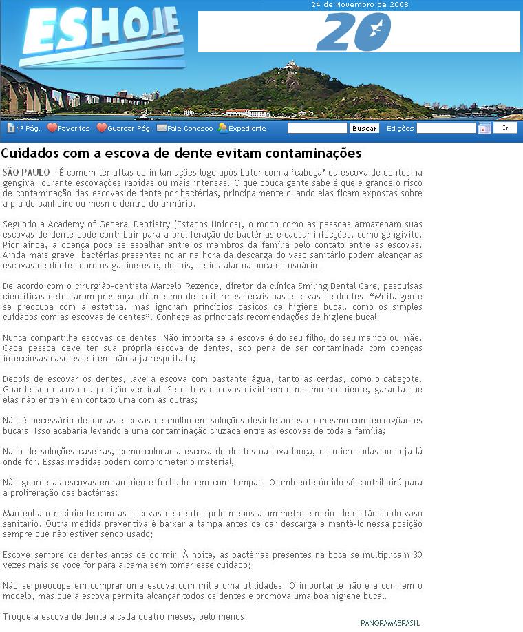 Clipping Jornal Espiríto Santo Hoje - Vitória (19 Nov) - Cuidados com a escova de dente evitam contaminações 26/11/2008