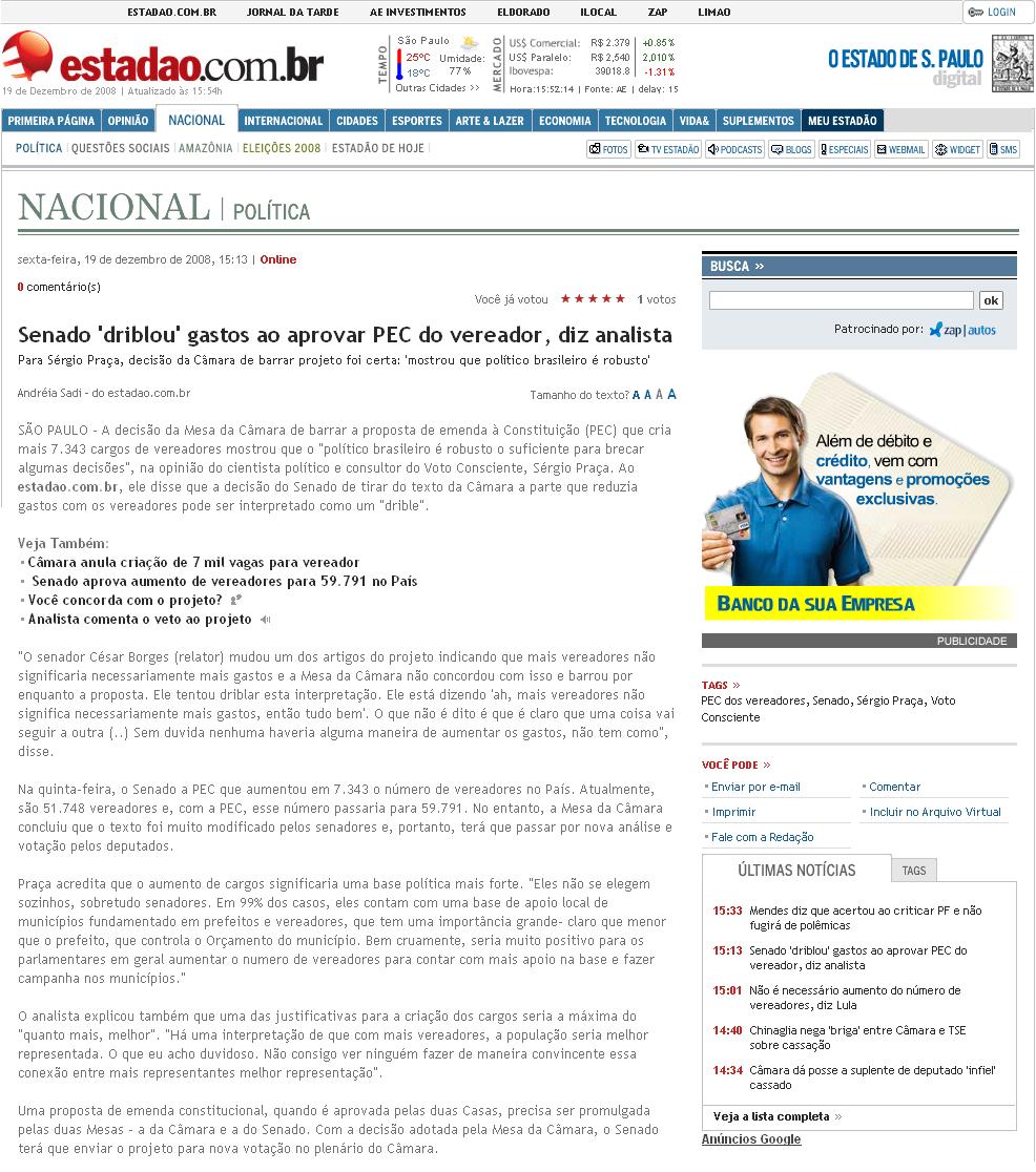 Clipping Portal Estadão - Senado 'driblou' gastos ao aprovar PEC do vereador, diz analista 19/12/2008