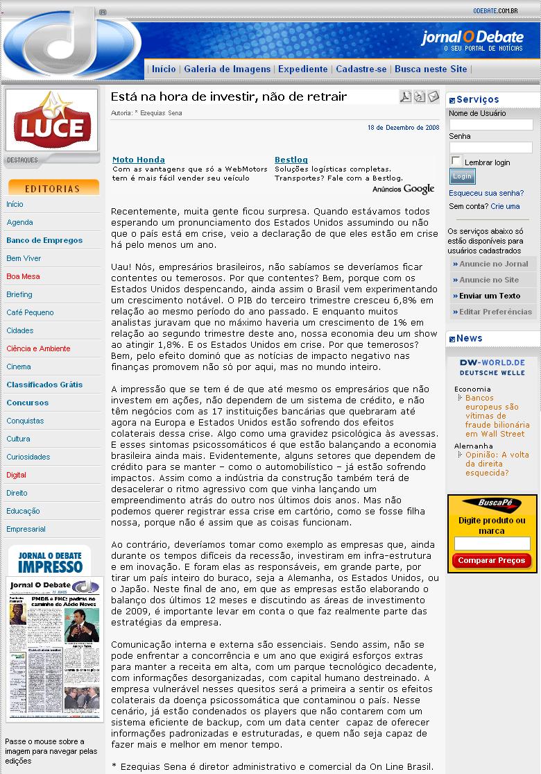 Jornal O Debate - MG (18 Dez) - Está na hora de investir, não de retrair