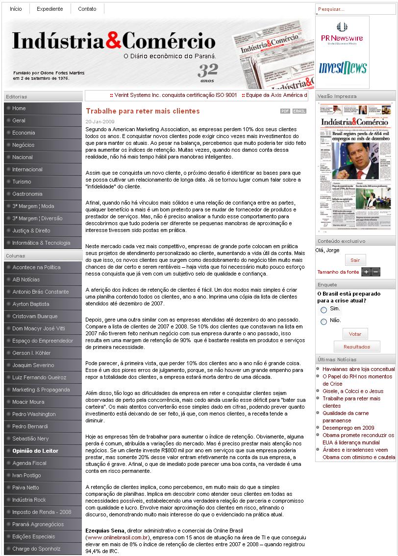 Jornal Indústria & Comércio (20 Jan) - Trabalhe para reter mais clientes