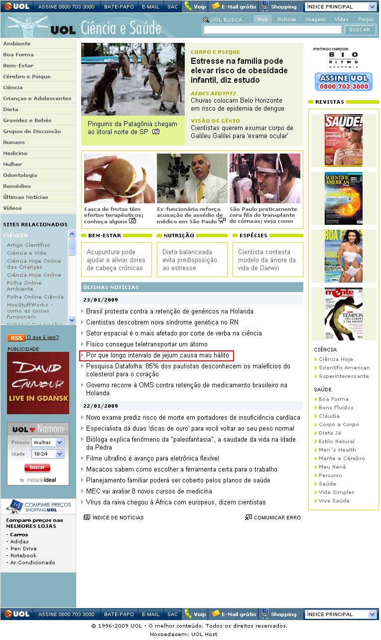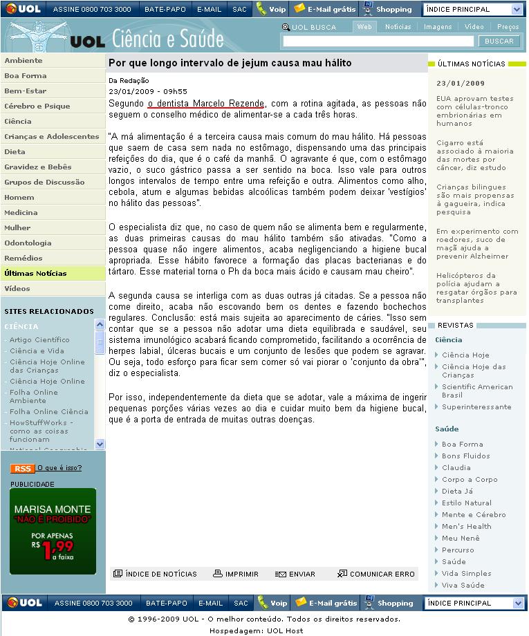 Clipping Portal UOL (Ciência & Saúde) - Por que longo intervalo de jejum causa mau hálito? 23/01/2009