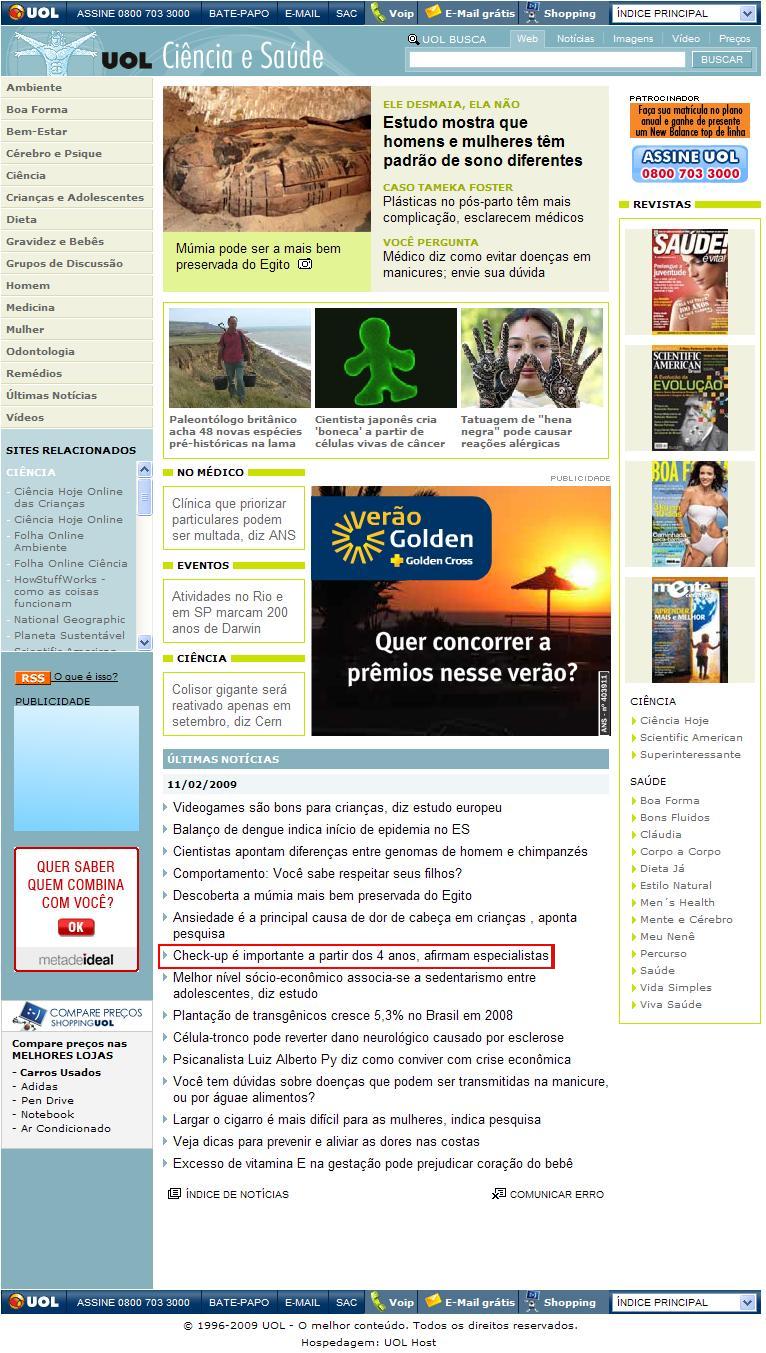 Clipping Portal UOL (Ciência & Saúde) - Check-up é importante a partir dos 4 anos, afirmam especialistas 11/02/2009
