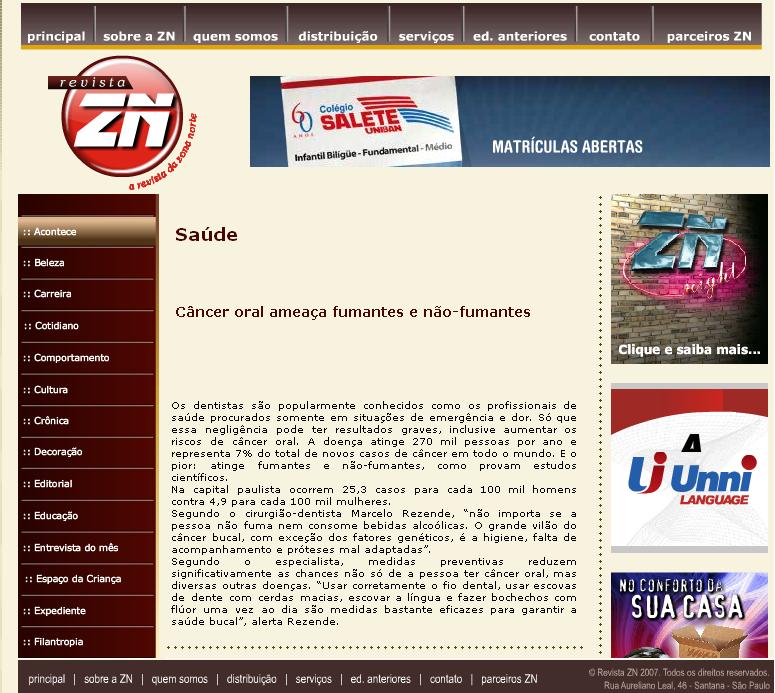 Revista ZN (Zona Norte - SP) - Câncer oral ameaça fumantes e não-fumantes