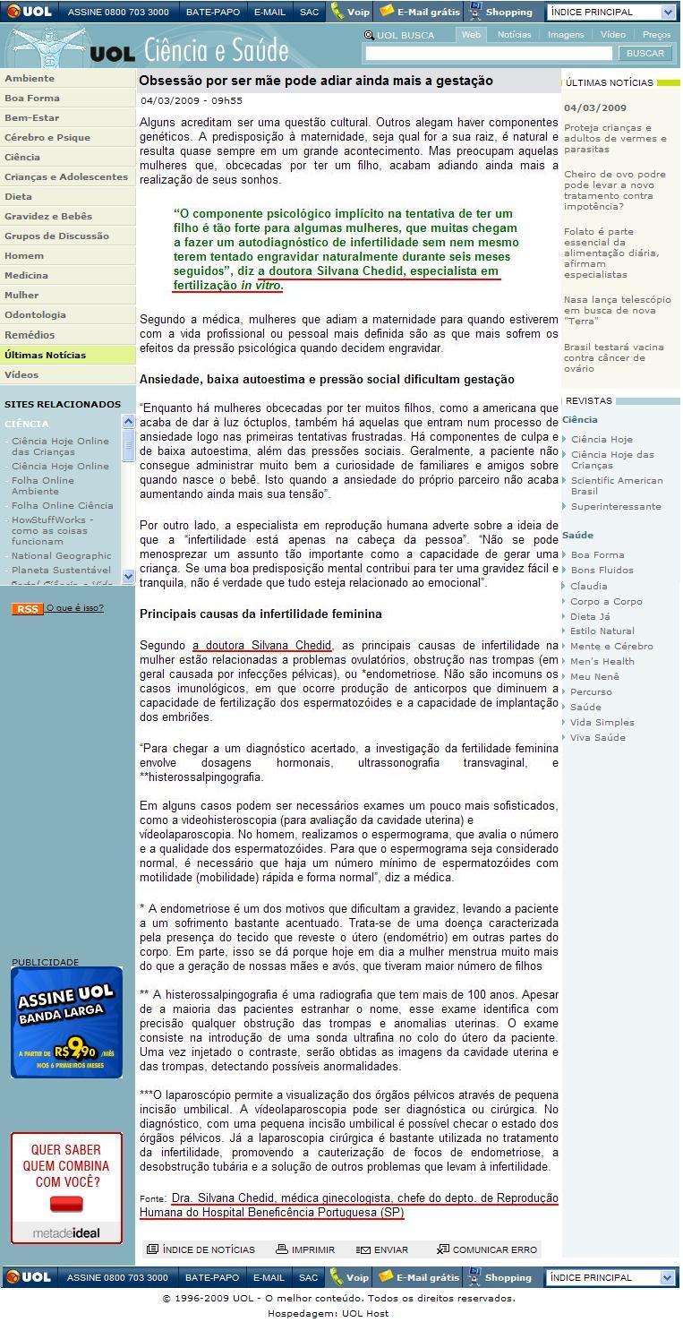 Clipping Portal UOL (Ciência & Saúde) - Obsessão por ser mãe pode adiar ainda mais a gestação 04/03/2009
