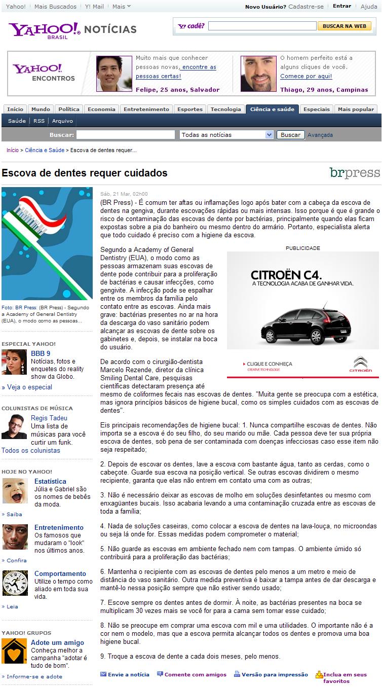 Portal Yahoo (Ciência & Saúde) - Escova de dentes requer cuidados