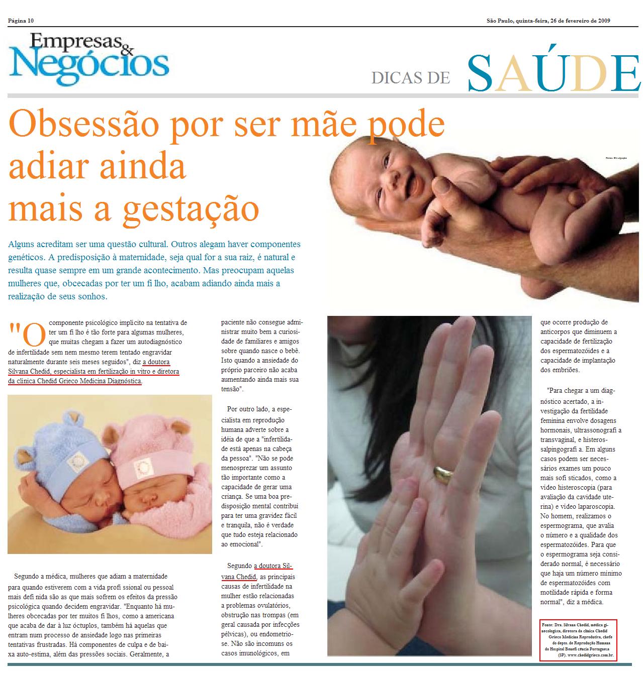 Clipping Jornal Empresas & Negócios (26 Fev) - Obsessão por ser mãe pode adiar ainda mais a gestação 27/03/2009