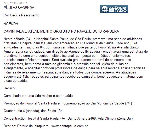 Clipping Agência Estado (AE) - Caminhada e atendimento médico gratuito no Parque do Ibirapuera 03/04/2009