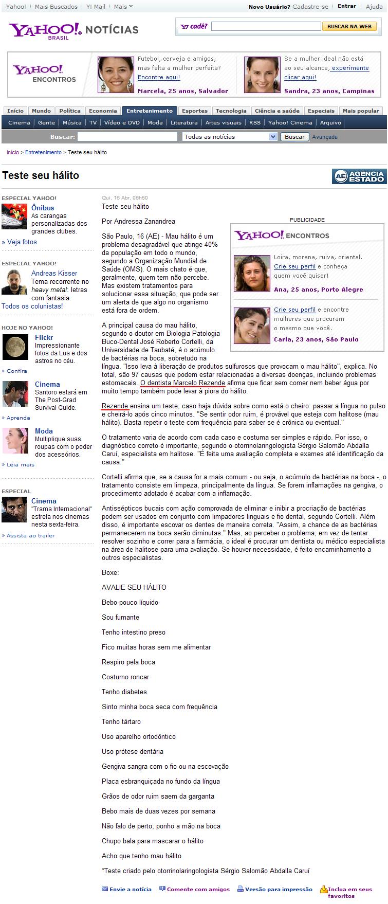 Portal Yahoo (Chamada de capa + matéria)- Teste seu hálito