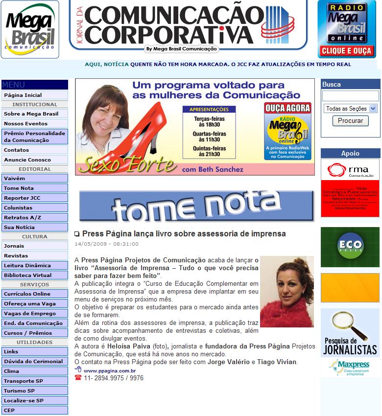 Clipping Jornal da Comunicação Corporativa - Press Página lança livro sobre assessoria de imprensa 14/05/2009
