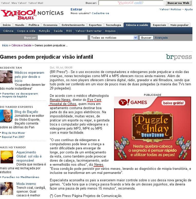 Portal Yahoo (Chamada de Capa + Matéria) - Eye Care