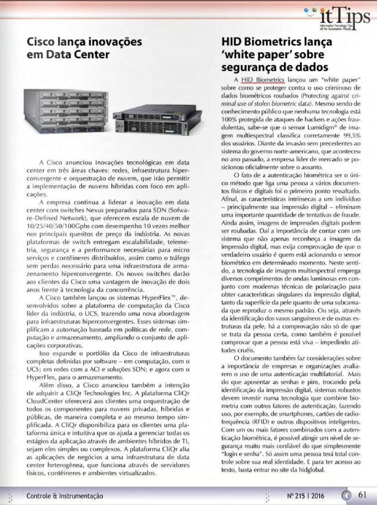 Clipping REVISTA CONTROLE & INSTRUMENTAÇÃO - HID Biometrics lança ‘white paper’ sobre segurança de dados 16/05/2016