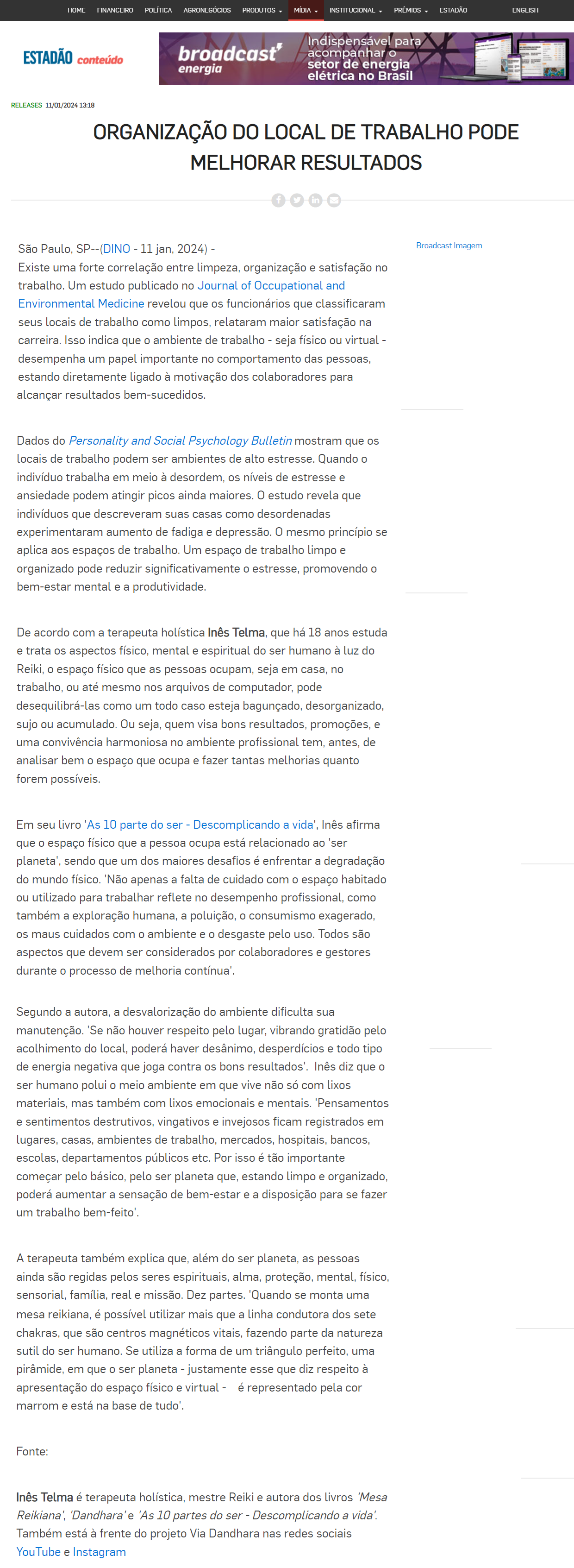 ESTADÃO BROADCAST - Organização do local de trabalho pode melhorar resultados