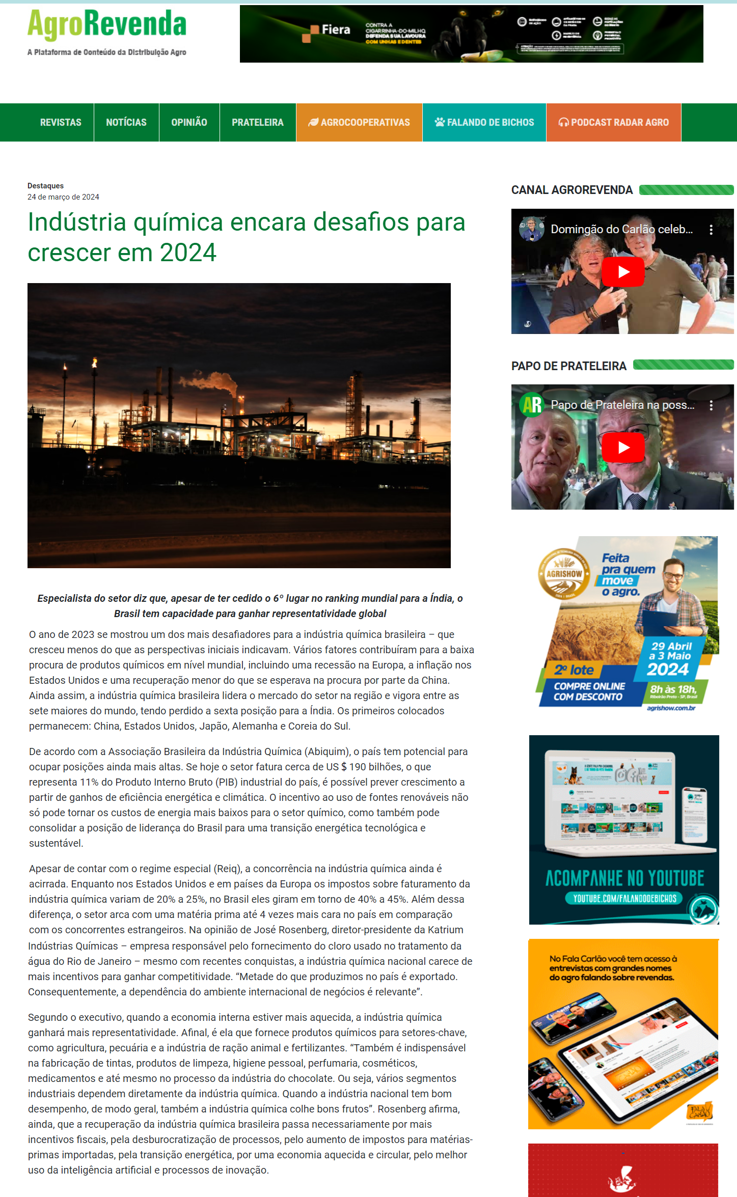 PLATAFORMA AGROREVENDA - Indústria química encara desafios para crescer em 2024