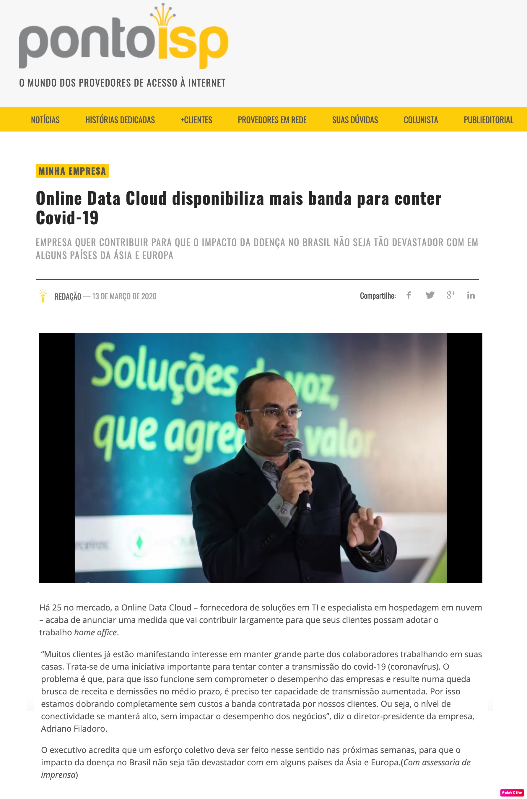 Clipping PONTO ISP (SITE) - Online Data Cloud disponibiliza mais banda para conter Covid-19 16/03/2020