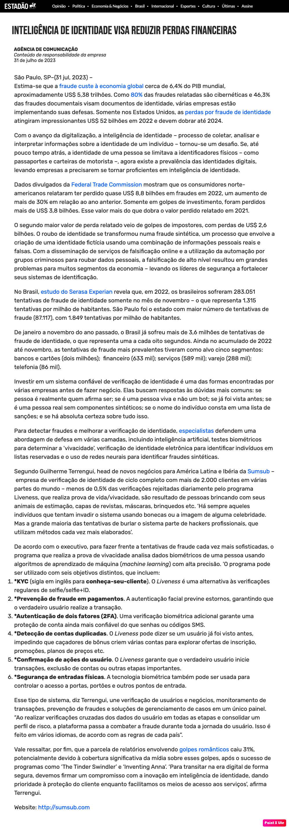 PORTAL ESTADÃO - Inteligência de identidade visa reduzir perdas financeiras