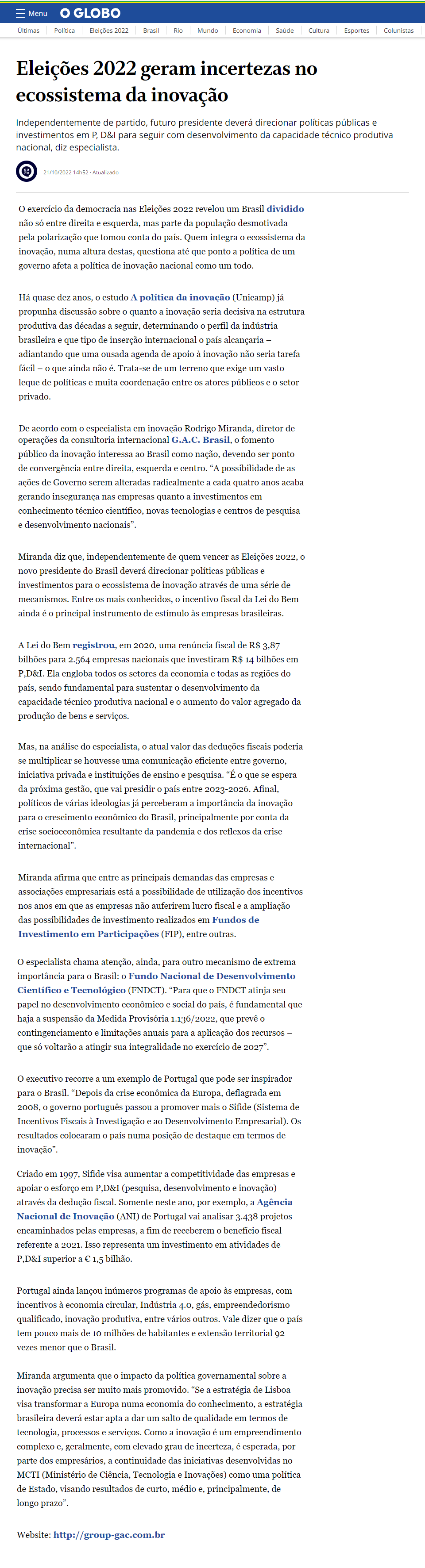 PORTAL O GLOBO - Eleições 2022 geram incertezas no ecossistema da inovação